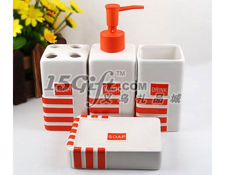 配套: 乳液瓶 牙刷插 漱口杯 肥皂碟顏色: 橘黃色 黑色尺寸:乳液瓶 6*6*17cm 牙刷架8*8*11cm 漱口杯 8*8*11cm 肥皂碟13*7*3cm包裝: 開天窗禮盒包裝