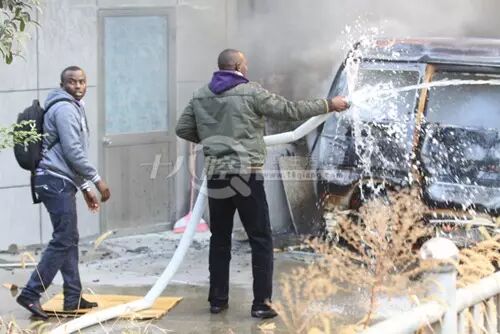 正在眾人束手無(wú)策的時(shí)候,一群外國(guó)友人從大樓里沖了出來(lái),手拿滅火器和水管不顧危險(xiǎn)向著小面包車(chē)沖了過(guò)去!火勢(shì)得到了一定的控制,為消防隊(duì)員的來(lái)到贏得了寶貴的時(shí)間!