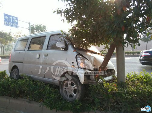 北苑路和賓王路交叉口,一輛面包車發(fā)怒了,連撞好幾顆樹,幸好沒有人員傷亡