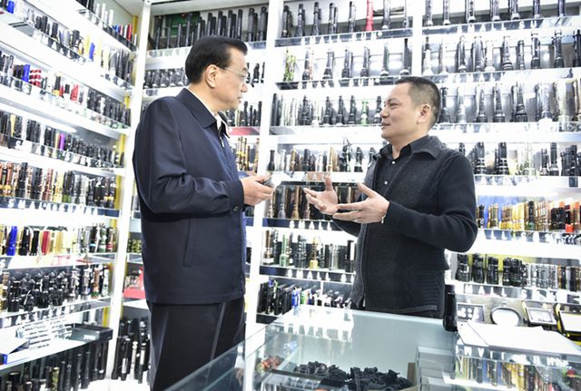 在商戶楊龍的店里,李克強(qiáng)拿起1個(gè)手電筒問(wèn)“是不是LED產(chǎn)品”,楊龍回答,是LED燈珠,用的是國(guó)內(nèi)生產(chǎn)的電管。李克強(qiáng)叮囑楊龍,要多開(kāi)發(fā)節(jié)能、環(huán)保產(chǎn)品,如太陽(yáng)能產(chǎn)品。