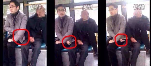 當(dāng)時(shí),小偷用自己的衣服蓋住老人家褲腿,利用車(chē)輛顛簸,用刀片劃開(kāi)老人褲子