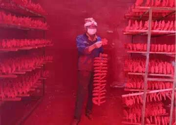 紅色遍布在天花板和地面,紅色的液滴從窗臺(tái)滴落,紅色的液體濺射在墻面上。這樣的場(chǎng)面,仿佛是當(dāng)代藝術(shù)家的前衛(wèi)作品。但實(shí)際上,它是圣誕神話背后的現(xiàn)實(shí)景觀。這是圣誕的工廠——離北極數(shù)千公里之遙,中國(guó)浙江的義烏。