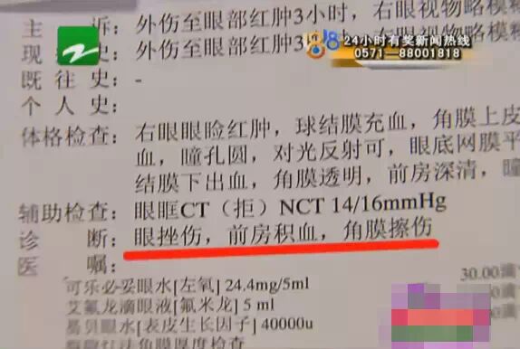 事后小易鼻血直流,自己一個人去醫(yī)院治療,也報了警,現(xiàn)在眼部還有明顯的淤青和血跡,醫(yī)院診斷是眼挫傷,前房就是眼白的位置,有積血,眼睛角膜擦傷。