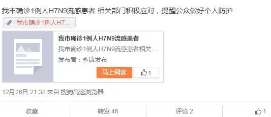 昨天晚上,永康市政府新聞中心官方微博發(fā)布消息稱(chēng):“永康確診一例感染H7N9流感病毒患者,相關(guān)部門(mén)積極應(yīng)對(duì),提醒公眾做好個(gè)人防護(hù)”