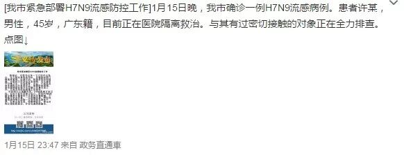 1月15日義烏市確診一例H7N9流感病例?;颊咴S某,男性,45歲,廣東籍,目前正在醫(yī)院隔離救治。與其有過密切接觸的對(duì)象正在全力排查。