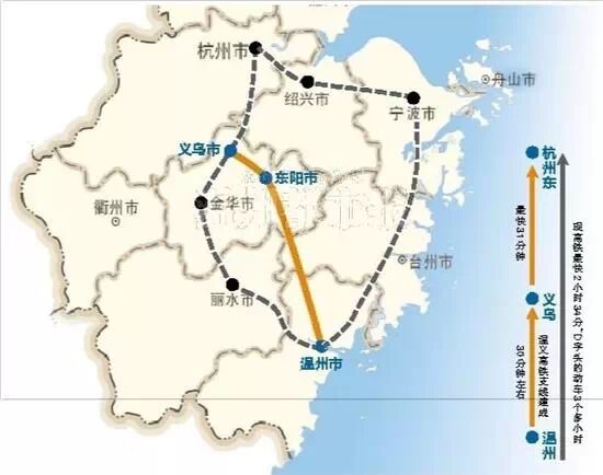 項目實施后有望實現(xiàn)“杭州溫州一小時,義烏溫州半小時交通圈”的說法。這份建議的設(shè)想是這樣的——溫義高鐵支線,是從杭長客運專線義烏站,經(jīng)東陽橫店到溫州,該線路連接溫臺沿海、浙中兩個城市群。