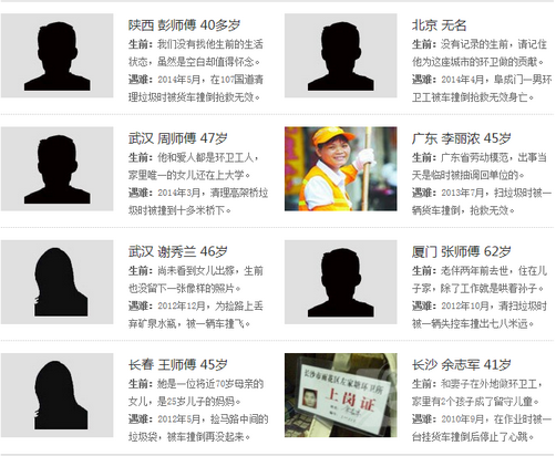 他們,大多數(shù)人在媒體的報(bào)道中并沒有留下一張照片,有些人甚至沒有名字的全稱,至于他們每個(gè)人生前的生活、身后后留下的家庭狀況,我們更不得而知。此外,還有和他們同樣遭遇的環(huán)衛(wèi)工并沒有進(jìn)入媒體的視野......
