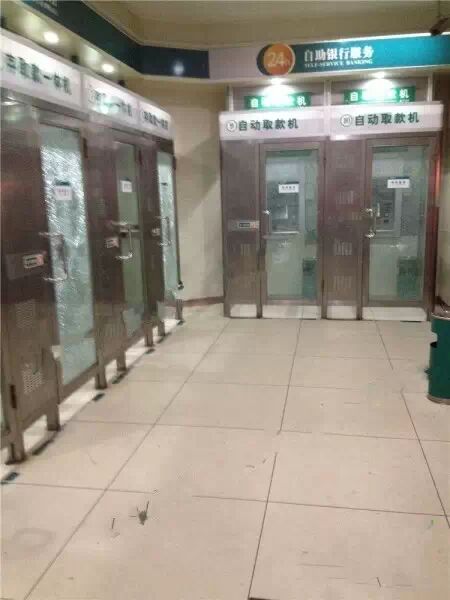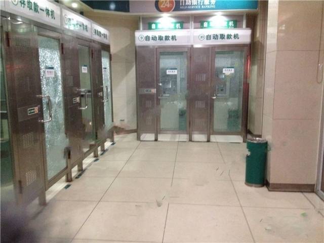 昨天晚上10點,有急事用錢,就去貝村路的農(nóng)業(yè)銀行取錢,可是為什么那么晚了居然還有人在排隊? 走近邊上門玻璃都是裂紋的取款機一看........我的乖乖,透過玻璃一看,取款機的顯示屏被砸了。一連五臺取款機都被砸了!