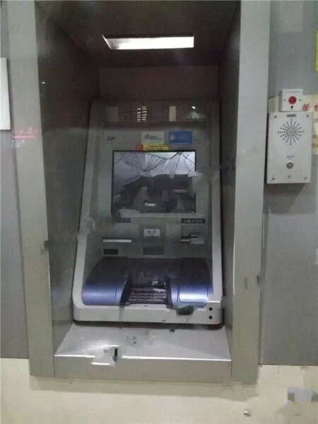 顯示屏破裂,黑屏,門被砸花,反正五臺全不能用了。這是什么仇啊什么怨,居然下此狠手?難道不怕監(jiān)控么?還是年底了囊中羞澀來銀行泄憤了?