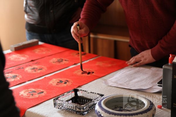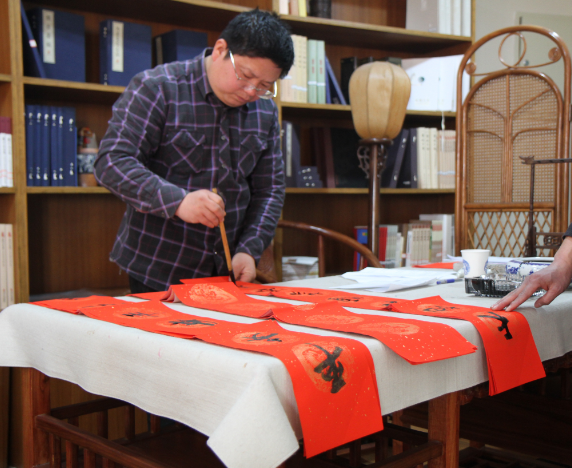 書法家筆下龍蛇騰躍,遒勁自然、瀟灑俊逸的筆法寫出一幅幅各具特色的春聯(lián)