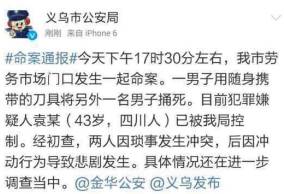 義烏市公安局發(fā)布命案通報今天(3月1日)下午17時30分左右,我市勞務市場門口發(fā)生一起命案。一男子用隨身攜帶的刀具將另外一名男子捅死。目前犯罪嫌疑人袁某(43歲,四川人)已被我局控制。經(jīng)初查,兩人因瑣事發(fā)生沖突,后因沖動行為導致悲劇發(fā)生。具體情況還在進一步調(diào)查當中。
