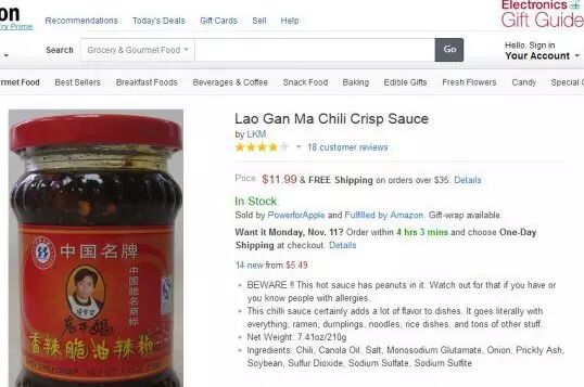 美國奢侈品電商Gilt 把老干媽奉為尊貴調(diào)味品,限時(shí)搶購價(jià)11.95美元兩瓶(約人民幣37元一瓶)。”
