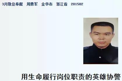 近日,在由中央文明辦主辦、中國文明網(wǎng)承辦的“學(xué)雷鋒在行動(dòng),我推薦、我評議身邊好人”活動(dòng)中,因公犧牲的義烏市公安局協(xié)警周勇軍作為我省三位好人代表之一,入選3月份中國好人榜。