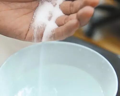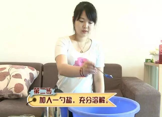 接著,我們往水里加入一勺鹽,稍稍攪拌,等到鹽充分溶解以后,就可以開始拖地了。