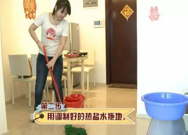 將拖把用熱鹽水浸濕,盡可能地?cái)Q干,把地板拖干凈。