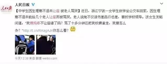 近日,一則寧波某中學(xué)女生因“姨媽痛”不給老人讓座被罵哭的消息,在網(wǎng)上迅速發(fā)酵。