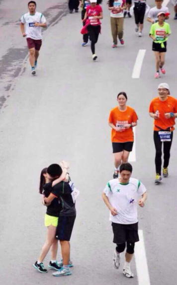 二、女子似乎有些體力不支,男子手牽著女伴,兩人咬著牙一同向終點(diǎn)沖刺。
