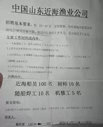 3月7號在勞務(wù)市場大門對面,景中旅館門口邊看到圍了幾十個人,人人手上拿了一張招工啟示在看,我懷著好奇也擠過去,向招工的人要了一張也看了起來。上面招工寫的是去山東煙臺近海捕魚,年齡在18到50歲之間,能吃苦耐勞,無犯罪記錄,身體健康即可。工資試用期保底6000元,一個月后轉(zhuǎn)正保底12000元,包吃包住,交五險一金等雜七雜八的,反正就是說工作累點,工資可觀。