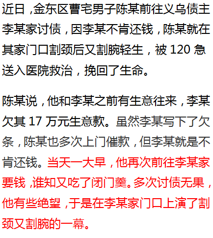 金華男子義烏討債不成,一怒之下竟割腕又割喉...