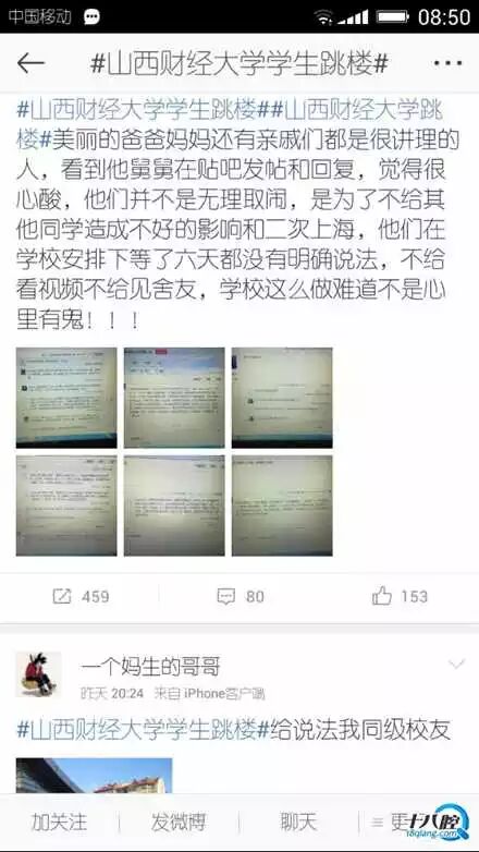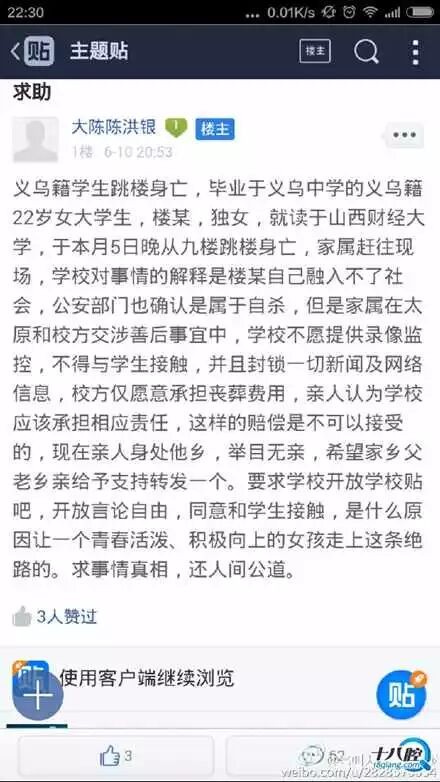 腔友 義烏軟妹子 在十八腔論壇發(fā)帖:《義中畢業(yè)生山西財經大學跳樓身亡 校方不給任何回復》,引起了大伙們強烈關注。