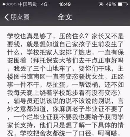 但學校的處理態(tài)度卻令人氣憤,不僅封閉學校消息、禁止師生發(fā)布任何相關信息,甚至威脅學生如有透露消息立即退學,而且一直不讓家長進入學校了解情況,不讓家長與學生、輔導老師接觸,可恨的還是將家屬一行人軟禁在校外賓館內,時刻安排人監(jiān)控家屬行蹤。