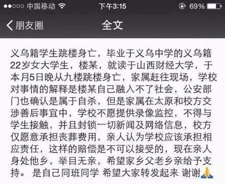 6月5日,一名就讀于山西財經大學的女大學生樓某在學校跳樓身亡,女孩子咱們義烏人,畢業(yè)于義烏中學。孩子的家屬趕往現(xiàn)場,學校解釋稱是樓某自己融入不了社會,公安部門也確認是屬于自殺。