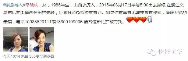 6月18日上午,義烏稠州論壇發(fā)布了一條“全城尋人!義烏30歲辣媽晨練離奇失蹤!3歲兒子喊媽媽!”的消息!