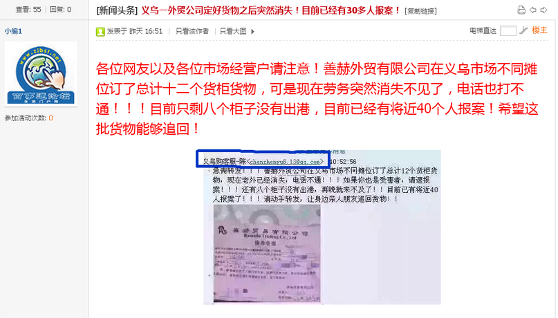 稠壇一網(wǎng)友發(fā)帖爆料說:“義烏一名字叫“義烏善赫貿(mào)易有限公司”的老外公司竟然在市場不同攤位一共騙了12柜子貨消失了.....