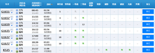 義烏到福州有六班高鐵,分別為: