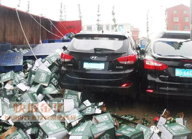 快報記者趕到現(xiàn)場時,交警已經(jīng)臨時封道,側翻出來的酒瓶把一輛黑色轎車硬生生擠到另外一輛車身邊。