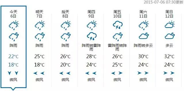 再看看未來七天的天氣:(中國天氣網(wǎng)2015-07-06 07:30更新)
