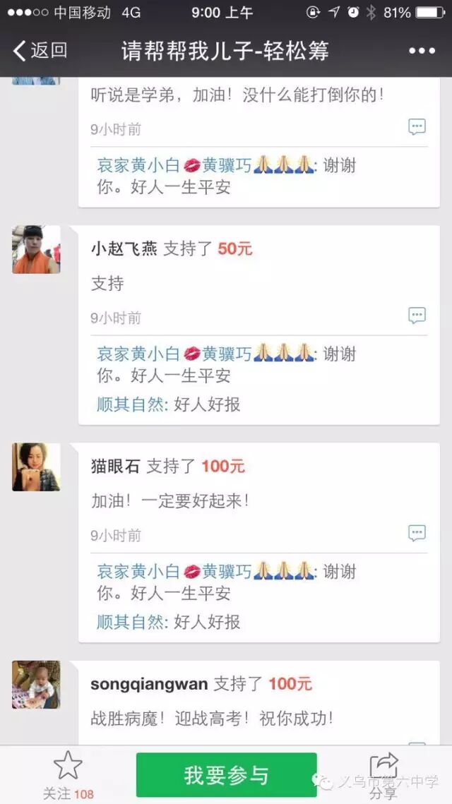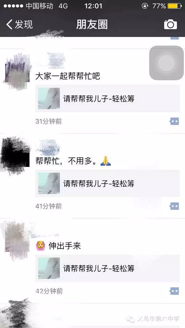 請(qǐng)幫幫我兒子,我們是義烏廿三里人,我兒子叫李文宇,現(xiàn)就讀于義烏六中高三十班。他爸于十年前患肝癌去世,母子倆一直相依為命,不幸的事災(zāi)難再次降臨,李文宇于去年九月份在北京大學(xué)人民醫(yī)院確診骨癌,就像天塌下來(lái)樣,母子倆堅(jiān)強(qiáng)的面對(duì)接下來(lái)的化療和手術(shù)??少M(fèi)用壓得我們喘不過(guò)氣來(lái),請(qǐng)好心人幫幫我們倆母子,謝謝!