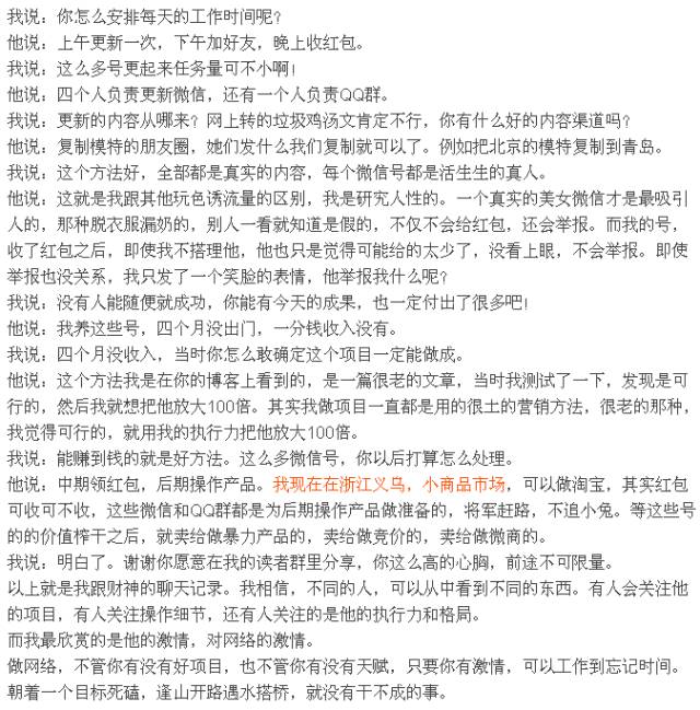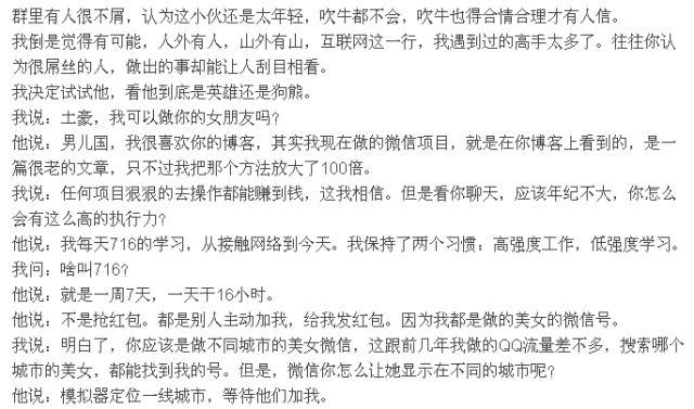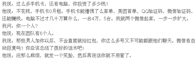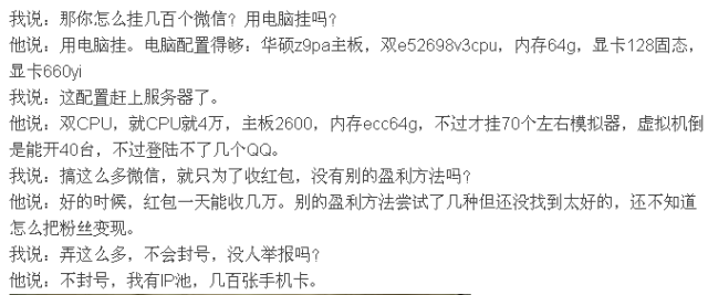 他說自己有76萬個QQ群,但是QQ群不賺錢,不如微信。他有600個微信號,每天收紅包就能收1萬多,真是收到手軟。