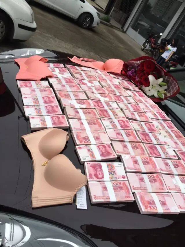 不看不知道,近看嚇一跳?。∵@輛保時捷卡宴的前引擎蓋上居然鋪滿了好幾十疊百元人民幣??!旁邊還有...幾個胸罩!什么情況?保時捷開回家,還有這種儀式?這到底是在賣胸罩還是在賣車?還是用胸罩在換保時捷呢?